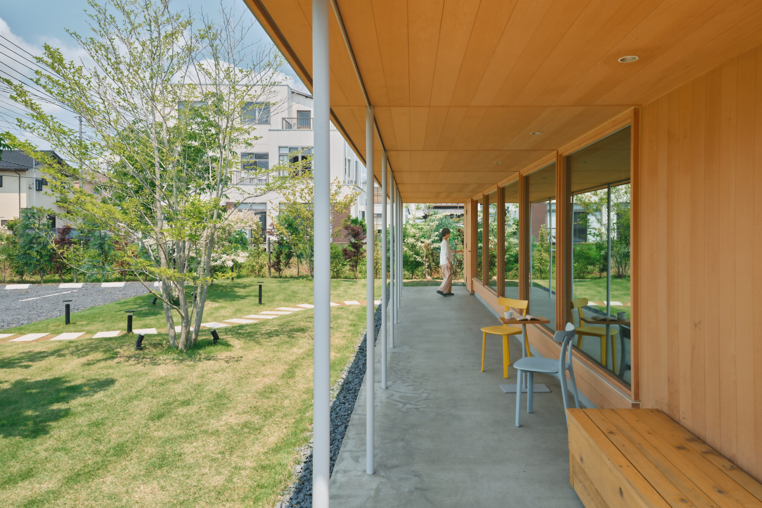 庭には大きな庇を設えたエントランステラスが寄り添います。この店舗のためのオリジナル造作です。