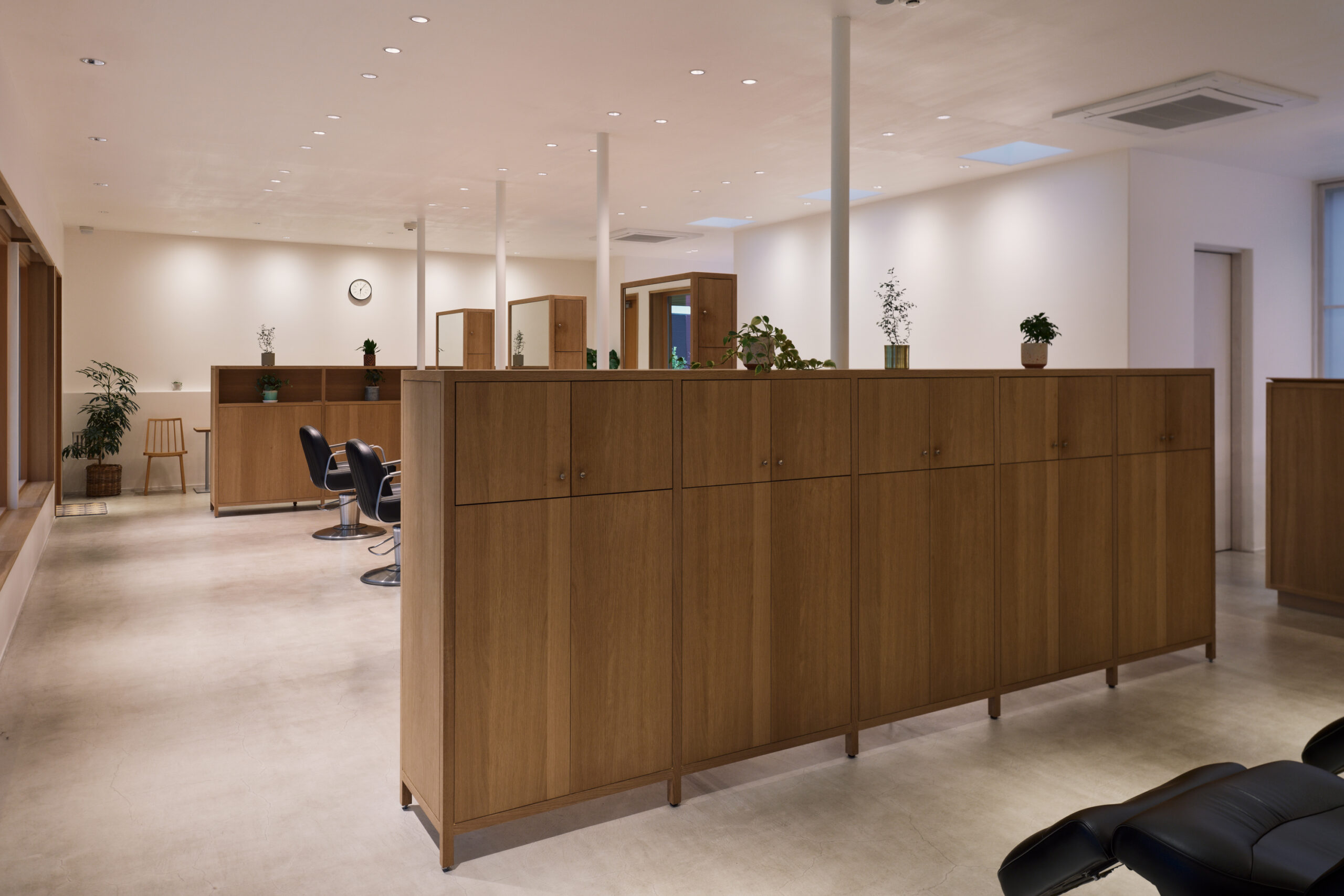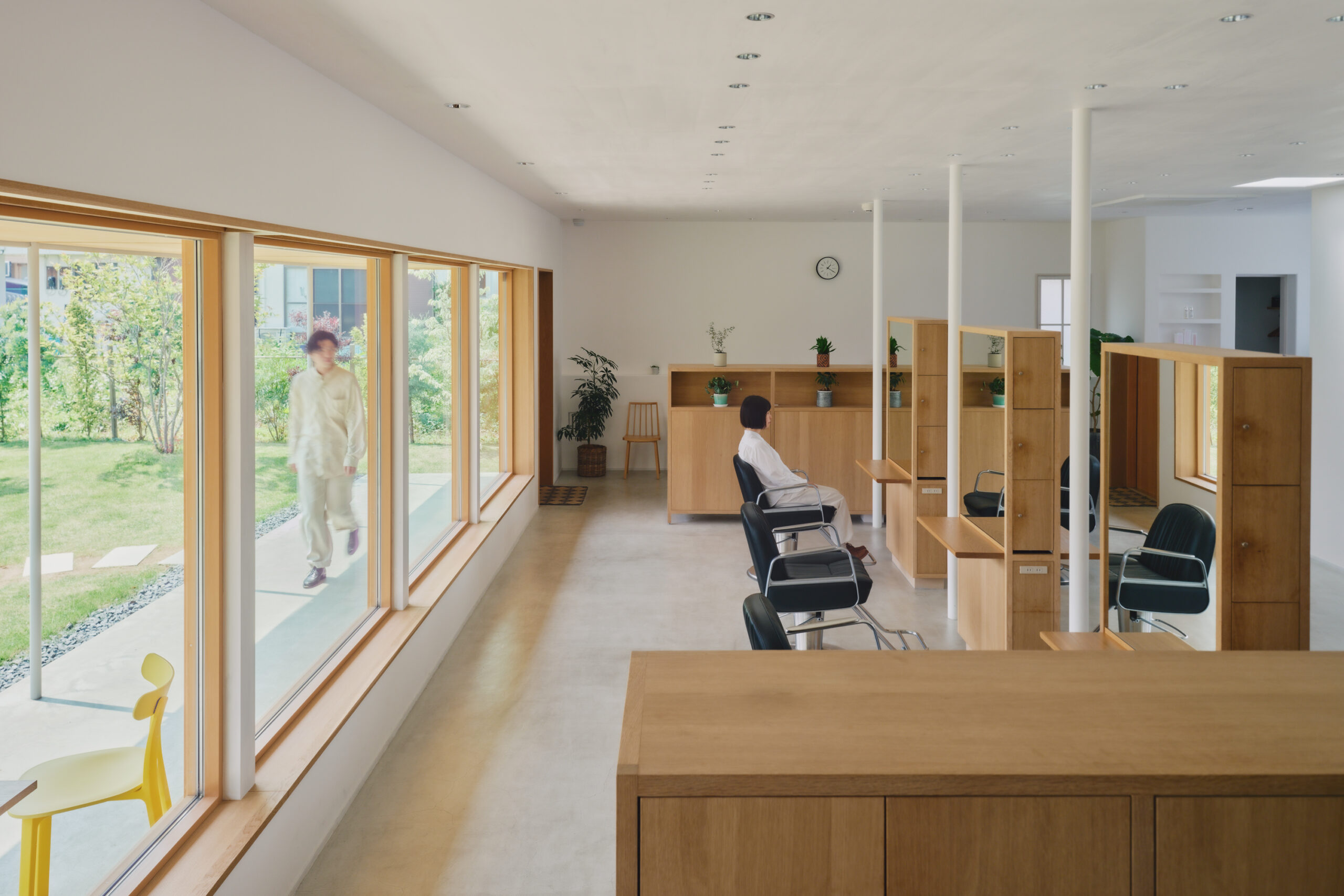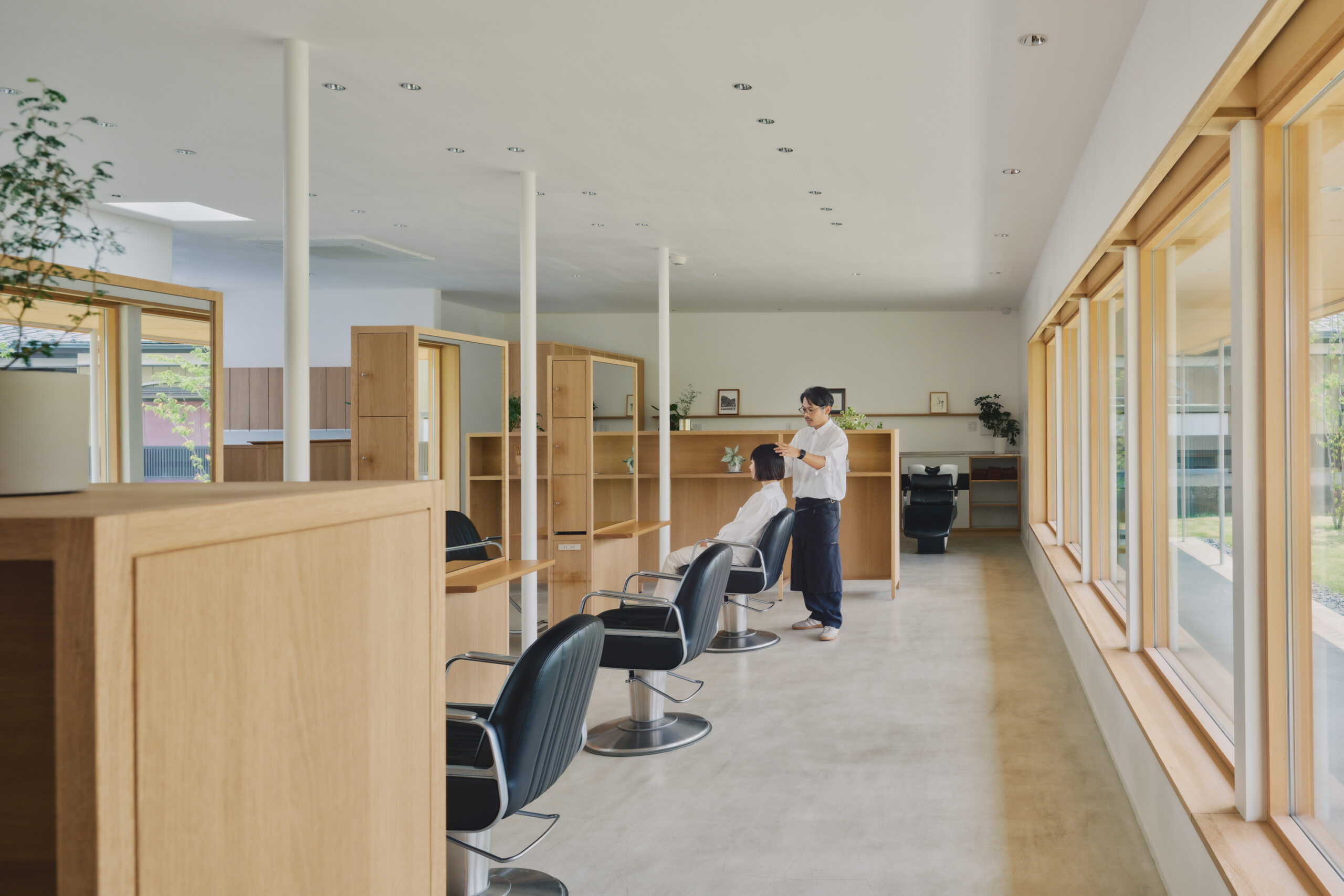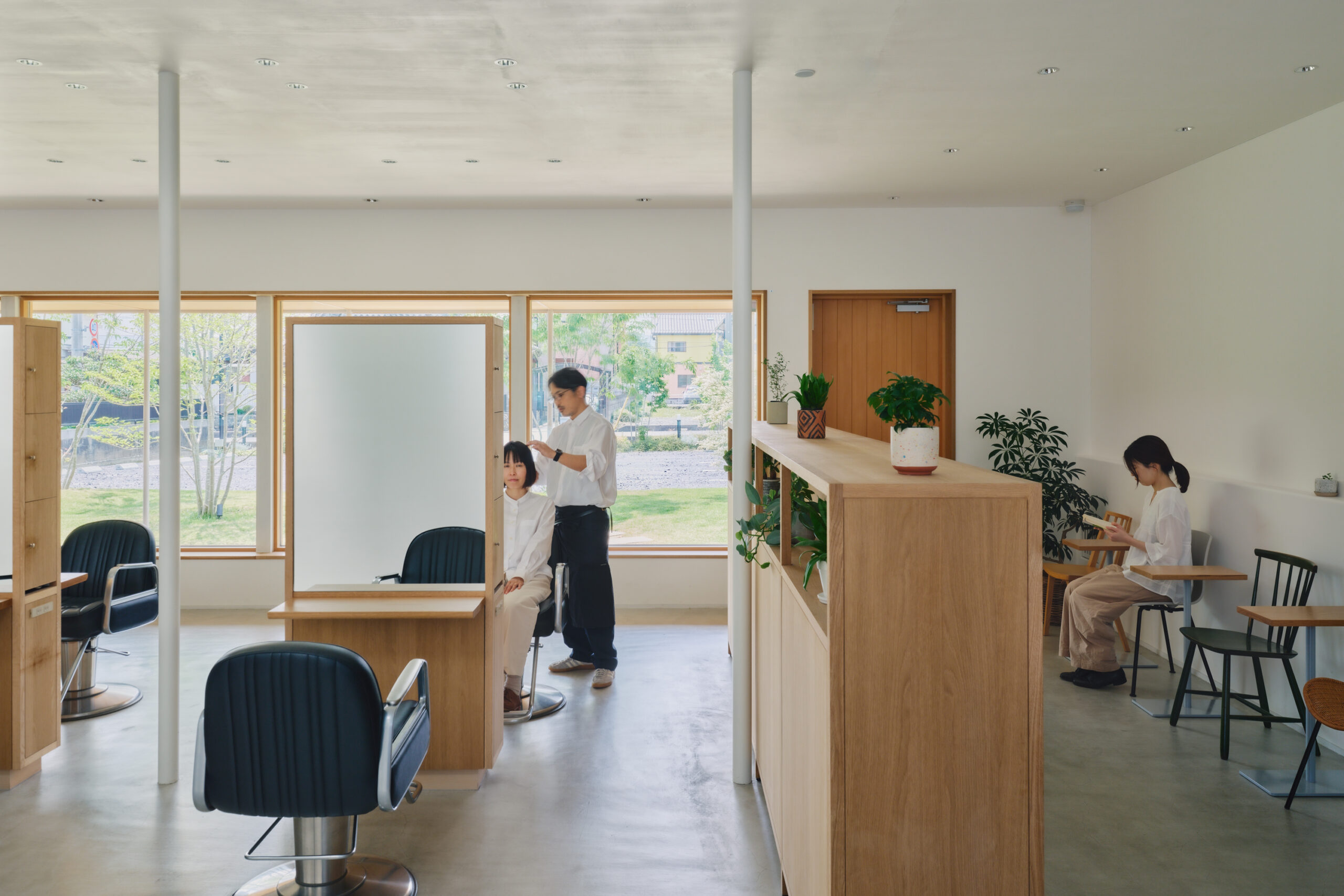↑この建築では、”人”は椅子に座ったりシャンプー台に身を預けると、同時に、自身のまわりの造作家具に身体を囲い込まれます。これが、別ゾーンからの視線を程よく遮断する効果をもたらします。