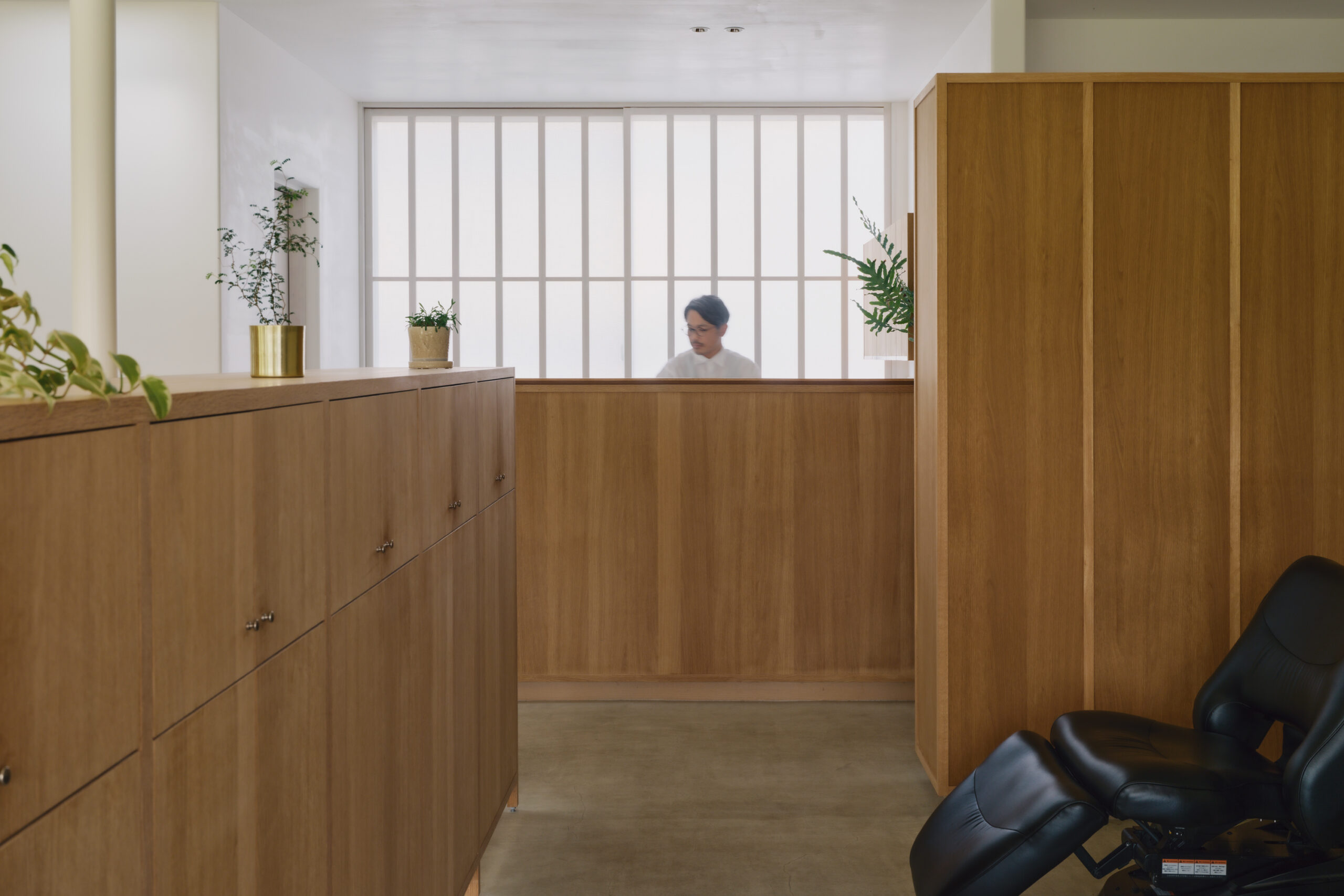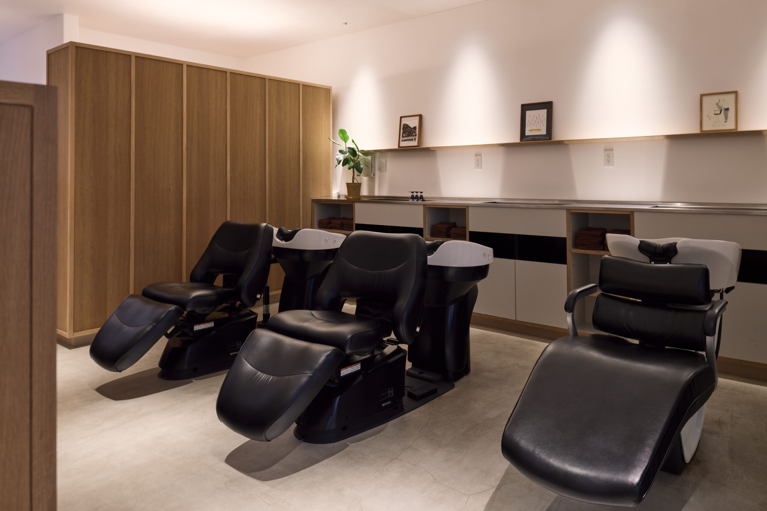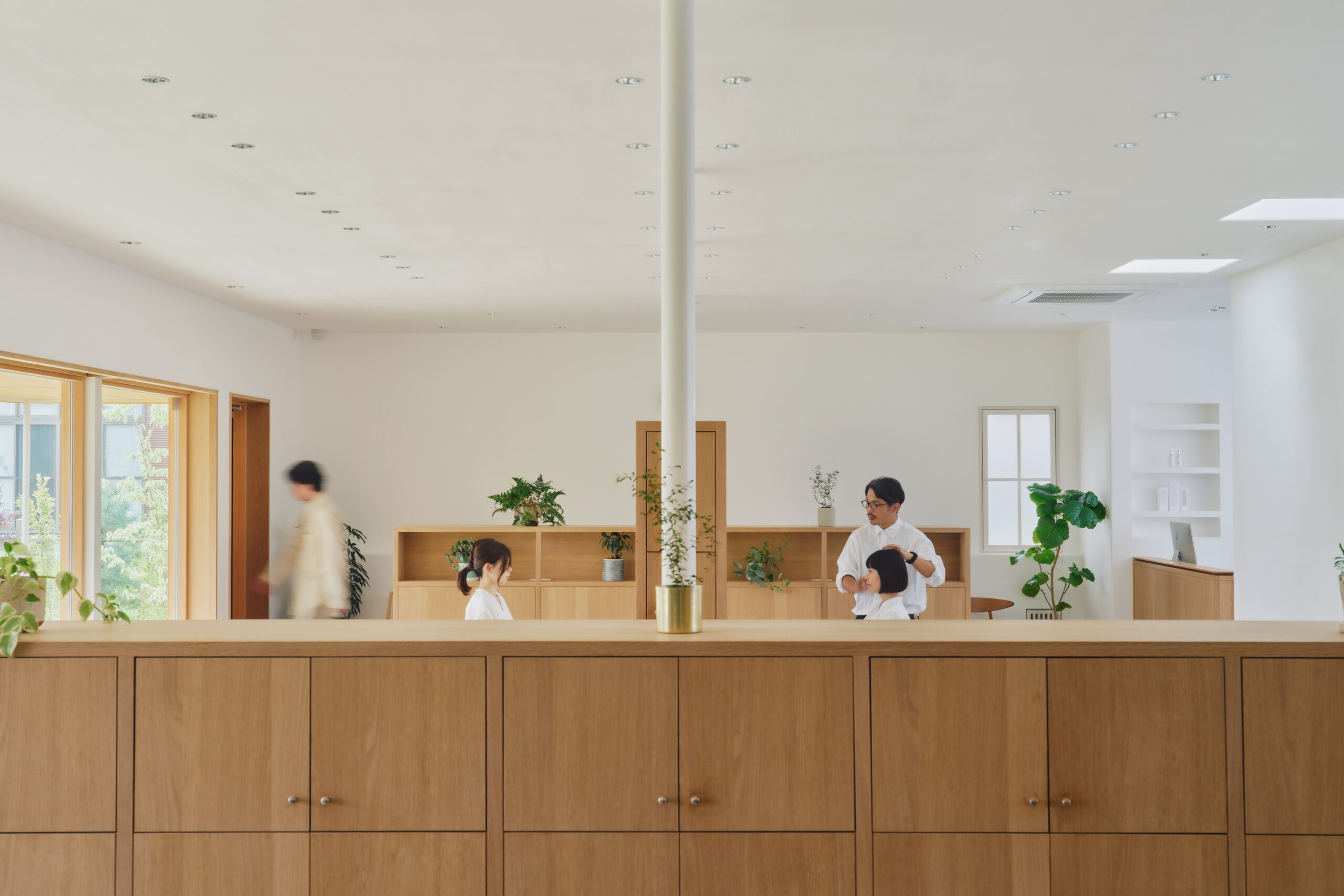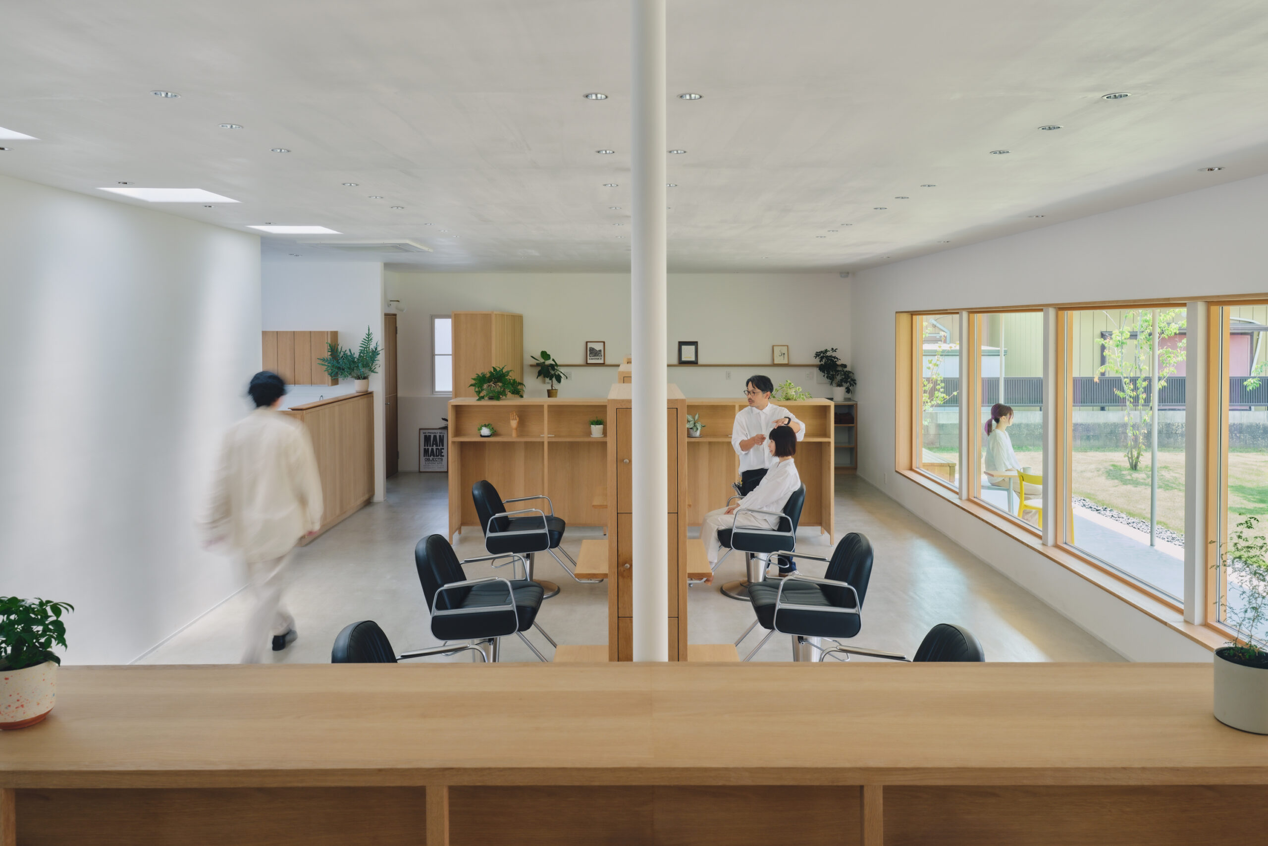 ↑この建築では、”人”は椅子に座ったりシャンプー台に身を預けると、同時に、自身のまわりの造作家具に身体を囲い込まれます。これが、別ゾーンからの視線を程よく遮断する効果をもたらします。