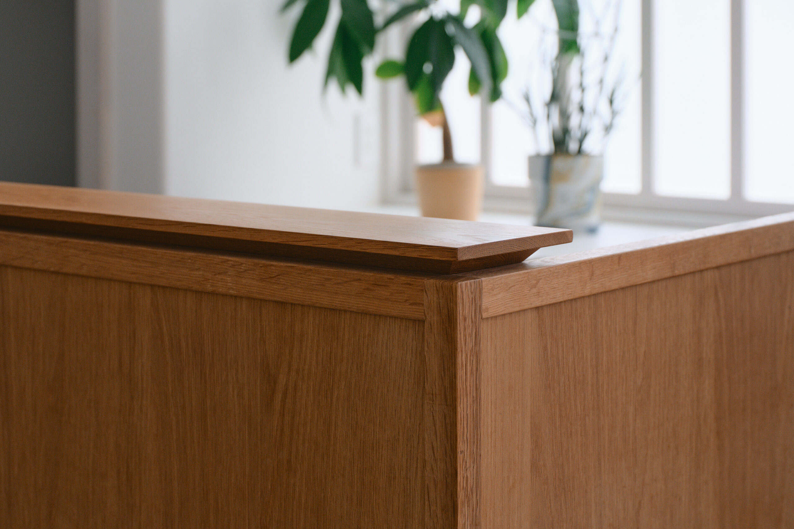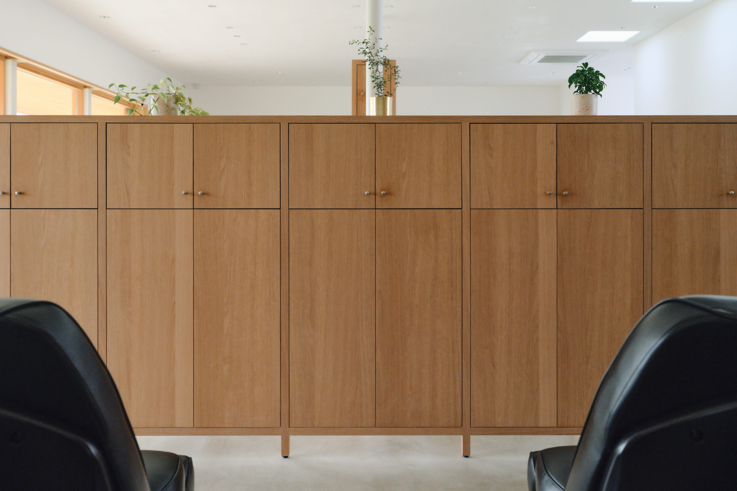 造作家具は、単に収納ができるだけではなく、”人”の視線の遮りや距離感をコントロールする「仕切り」と見立てることで、”人”の居心地そのものに寄与できるように設計しました。